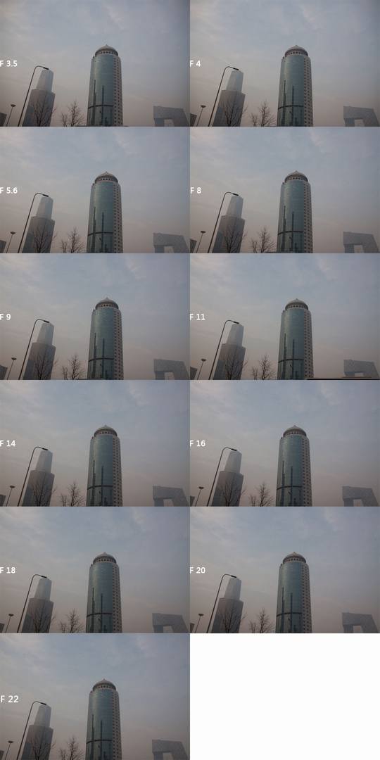 从上图可以看出,这只镜头在f3.5-f4的时候锐度还不尽人意,光圈收到f5.6以后表现尚可, 从f9-f16之间成像趋于平稳,从f20以后成像质量下降比较严重。18mm端最佳成像在f5.6-f8之间。