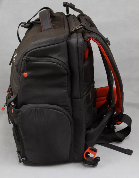 从侧面的图片可以看出这款双肩摄影包厚度的体现,说明了里面的空间不是你所担心的问题,宽大厚实的双肩背带也可以给你的肩膀带来不错的舒适体验。
