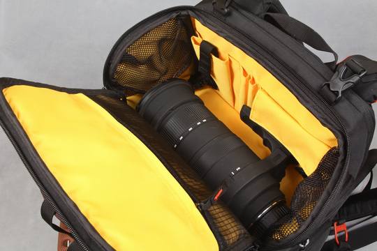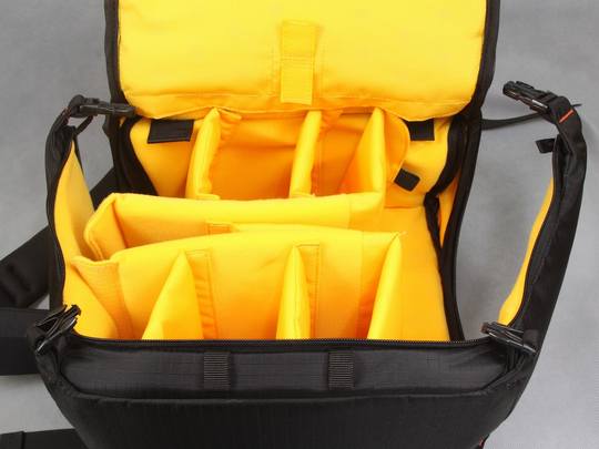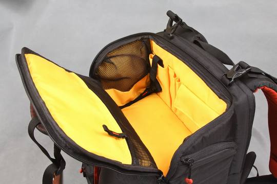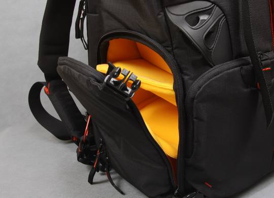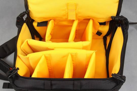 这款摄影包的一个重要的特点就是其下层隔舱的设计是完全开放的,靠拉链贯穿整个隔舱,如下图所示:
