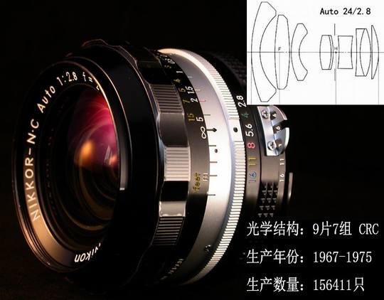 1967年,日本光学推出了震动业界的Auto24/2.8,原因在于尼康发明了浮动镜片对焦系统(CRC),并首次应用在Auto24/2.8上。这的确是一项伟大创举,整组对焦一大缺陷就是随着对焦距离接近,画面四周像差也呈快速上升,镜头焦距越短,光圈越大,这一现象越严重,CRC的出现,明显改善了近距像差。有报道说,尼康开发这一系统,耗时近十年。大家知道,那是一个没有高速电子计算机,缺乏镜头测试专用设备,更没什么设计软件的年代,人们必须通过实际拍摄后的图像来看镜头成像结果,反复进行枯燥乏味,费时费力的像差校正计算,当年设计师走过的道路极其艰难。由于有了CRC系统,Auto24/2.8在近摄时,画面四角有了足够的亮度,并且四角慧差大幅降低,成像变得锐利。十多年后有更多改进的Ais24/2.8问世,相比之下,Auto24/2.8光学性能略逊一筹,但自己从拍摄的结果看并没感到不满,N24仍不失为一支优秀广角镜。