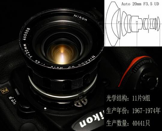 在划时代的F型单反机推出的8年间,日本光学(Nippon Kogaku)还不能向市场提供能正常使用的超广角镜头,之前的2.1cm/4仍是按旁轴机光学设计,装在大F上必须把反光板锁上,取景看左边闪灯座上取景器。到了1967年,日本光学工程师终于完成了反望远设计的UD Auto20/3.5。那时,设计师不仅受困于高折射玻璃缺乏,超广角光路带来的天量繁琐计算更是困难重重,1967年完成的设计能与今天镜头媲美实属不易!UD Auto20/3.5是一款成像优秀超广角,该镜头以可靠的光学设计实现慧差达到最小,因此,在各光圈档位均可实现良好的锐利和反差。在全幅机上,镜头线性失真很小,与10年后的Ais20/3.5相比,两者畸变像差基本一致。UD Auto20/3.5做工精良,牢固耐用。手中一只UD20,外表非常陈旧,原来主人一定是干专业的,镜头虽身经百战,几十年后性能依然丝毫不差。
