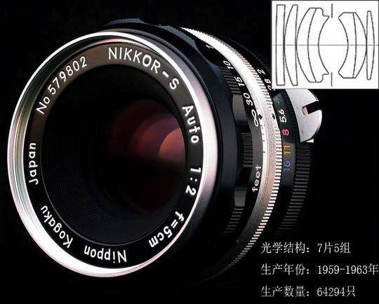 尼康并不滿意1959年的5.8cm/1.4,在推出的当年便着手开发更“标准”的50mm/1.4,整整两年后完成设计,7片5组构成,负镜组比H50/2多了一块镜片,那是用来克服大光圈下更严重的球差和像散。S50/1.4产量惊人,超过110万只,不知这个数字是否准确,但能用低价买到f1.4光圈的也只有50mm镜头,销量自然会高。最新的50/1.4G号称全新开发的光学系统,其实到目前,还没有一只大光圈标头能脱离双高斯结构,50/1.4G只是后镜组再分出一片,修正一点离轴慧差,包括50/1.8G至多称改进。
