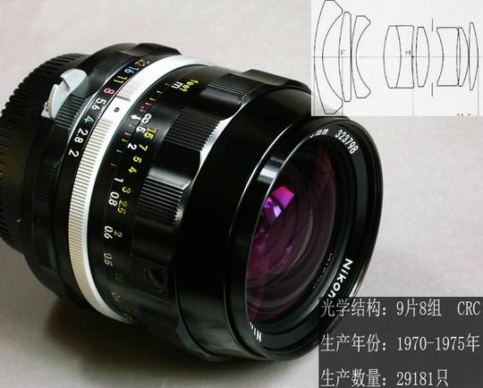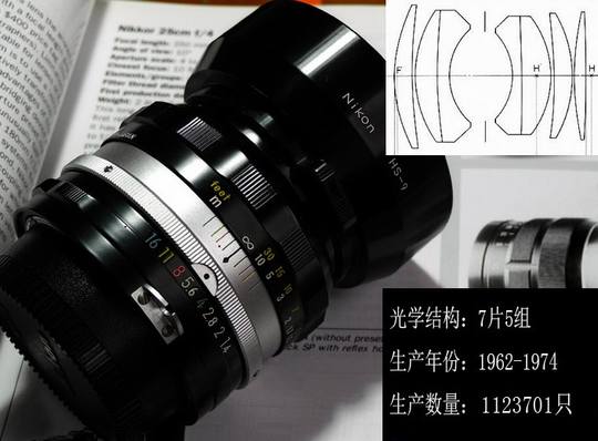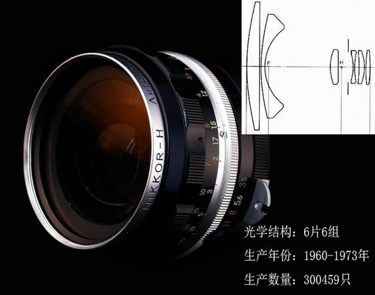 直到上世纪50年代,开发SLR用广角镜头仍是个难题,虽然欧洲已先于日本研究反望远结构,但法国Angenieux公司在1953年推出反望远设计的Type R11 28mm/3.5单反镜头光学上仍有明显缺陷,主要表现在离轴光线成像慧差严重。当时尼柯尔镜头主设计师胁本善司在设计28mm镜头时,用大口径平凸透镜和凹凸透镜作为镜头第一、二块正负透镜作反望远设计,并把Type R11后组中两镜片凸凹位置对换,这样一来,四周慧形像差获得明显改善,千辛万苦设计终于取得成功,28mm/3.5在1960年上市。H28/3.5成功的意义更在于为尼康设计广角镜形成自己独特的风格,后来人们在评价尼康镜头时,它的广角总是充满赞誉之词,诸如后来的Ais24/2.8、Ais28/2.8、Ais28/2、Ais35/1.4等都是一代名镜。