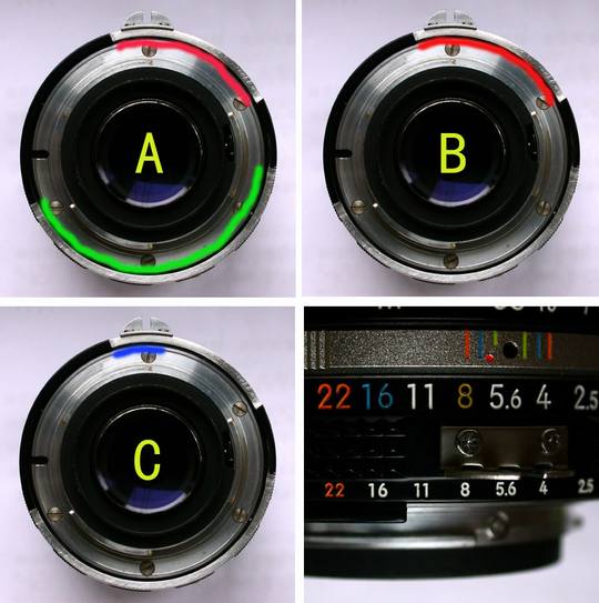 光圈环锉法,如图:A图锉掉红线和绿线部分,可用于任何尼康单反机身。B图只锉红线部分,只用于D2、D3系列,D200、D300、D700、D7000等。C图只锉兰线一小段,也可使D2、D3系列,D200、D300、D700、D7000等机身进行光圈优先曝光,手动测光。此锉法优点是镜头破相小,缺点是装镜头须把光圈环转到最小。图以105/2.5为例