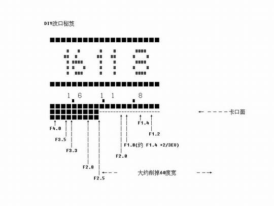 f1.2-f4实际位置。右下图是f1.2、f1.4、f2的小口锉法位置,装上兔儿耳后,锉口可完全盖住
