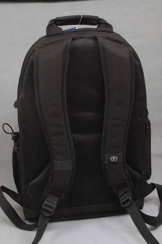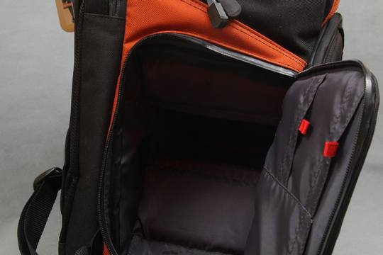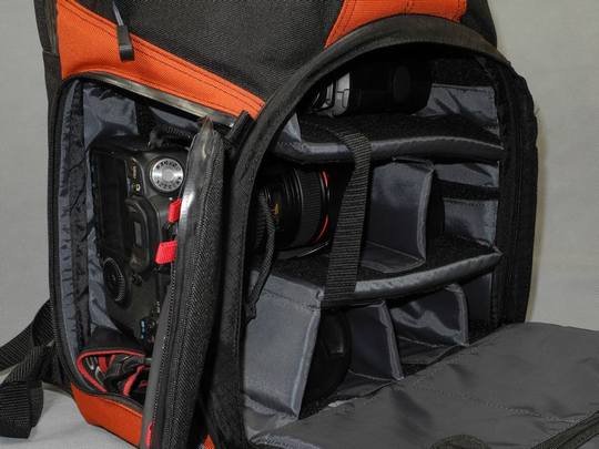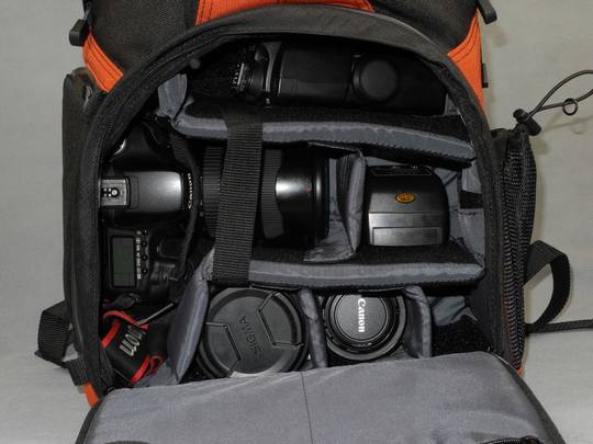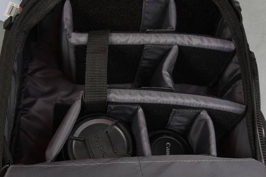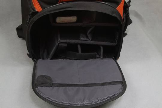 摄影包“腹部”为器材仓,中间“T”字形部分可以放下一台中高端单反机身配70-200/2.8之类中长焦镜头,仓位中有绑绳设计来固定较大的器材,不至于倾覆。“T”型仓上下有几个小仓位,可以放下四支小体积镜头和闪光灯、引闪器等。
