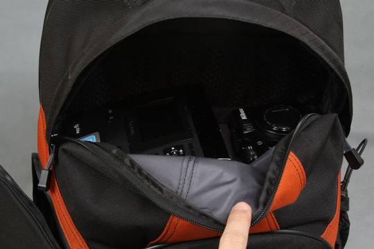 这款摄影包正面分上下两个大仓位,上仓位空间比较大,完全可以放下一款带镜头的单反相机。