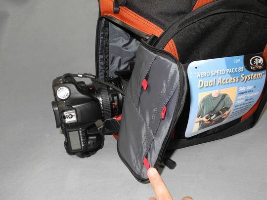 比较巧妙的设计是这款相机包侧面可以拉开拉锁迅速从器材仓位中拿出放在“T”型仓的单反相机。这种设计现在非常流行,可以很方便地取出照相器材来捕捉自然界稍纵即逝的瞬间。