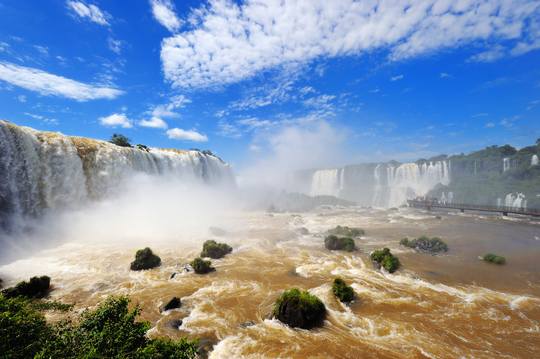 伊瓜苏瀑布位于阿根廷与巴西边界上,为马蹄形瀑布,高82公尺,宽4公里,超过非洲赞比亚和津巴布韦边界的维多利亚大瀑布宽度并几乎是美加边界的尼亚加拉大瀑布的四倍,被誉为世界上最宽的瀑布。据介绍伊瓜苏河的平均水流量约为1700立方米/秒,雨季的最大水流量可达12750立方米/秒。这样水量的河在进入巴拉那河峡谷之前遇到了平均落差约72米的崖壁,形成了排列在4000多米长度崖壁上大小不同的275个瀑布,咆哮而下,气势之宏大无以言表。我用各段焦距在不同位置横拍竖拍上拍下拍,从阿根廷拍到巴西,用尽浑身解数也无法拍出一张让我感到满意的起码能表现出伊瓜苏大瀑布60%以上气势的照片。 这样的场景用摄像来记录可能会好很多,下次去可能家用3D摄像机已经很成熟了,一定带上一台。上一些到此一游的照片,大家就当资料片来看吧。