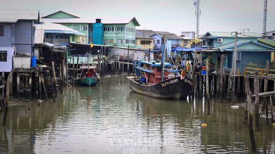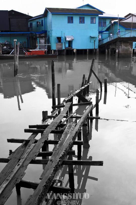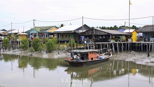 真实的鱼岛写真,现在是落潮,水位很浅,可以看到这里的房子都是打桩建设的,基本上每家都有个小码头和自家渔船。