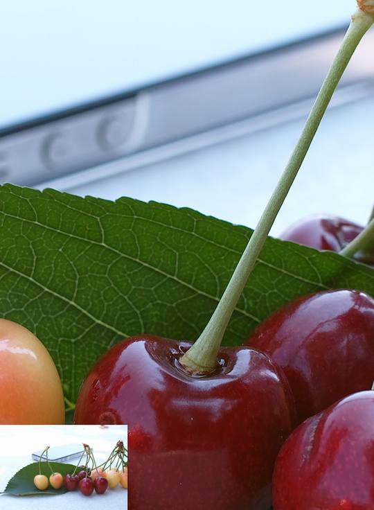拍摄说明:是在果园门口的一个台面拍摄,强烈的阳光投在台面上,樱桃我是用帽子挡了阳光,是在阴影里面,台面其它物品都暴露在强光下,光比起码6级起吧(大约),有条件的模拟拍摄拍摄就知道有多考验机器的事情。