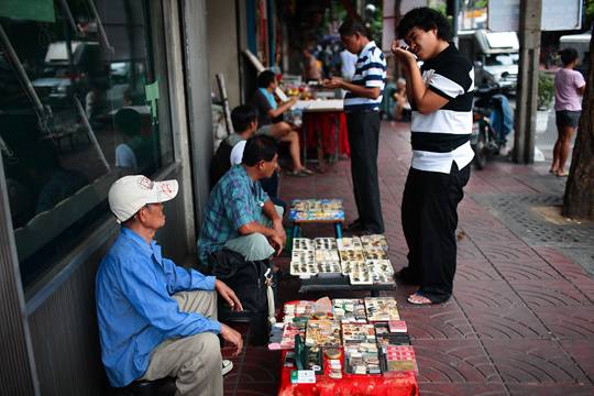 街边的古董摊,买家还煞有介事地拿着放大镜仔细甄别。