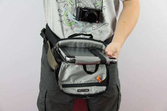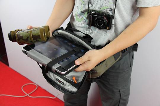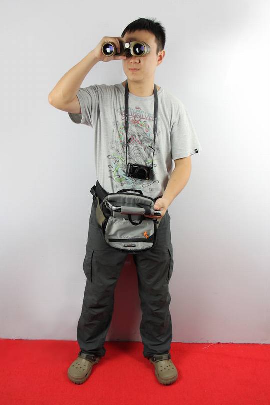 而乐摄宝FS-DO最大的特点是专利的设计评拉式Quick Shelf面板,它可以很好的将用户的IPAD或是记事本固定在上面,起到稳定性,即使用户在户外使用望远镜时,也不必担心Quick Shelf面板上的物品会掉落,同时,乐摄宝FS-DO还提供了可以调节的内隔层,专门放置望远镜使用,隔层采用了加厚的材料,更加的牢固。但由于包的大小有限,所以置入的望远镜也有限,只能是最大至8x40的大小。
