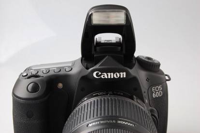 机身正面,与佳能的中端机型差异不大,闪光灯部分相较于前代有所升级,拥有了7D相仿的内闪无线TTL控制外闪的功能,可通过内闪发射脉冲信号无线控制原厂的580EX II、580EX、430EX几款闪光灯以及日清、美兹等兼容无线从属功能的闪光灯。