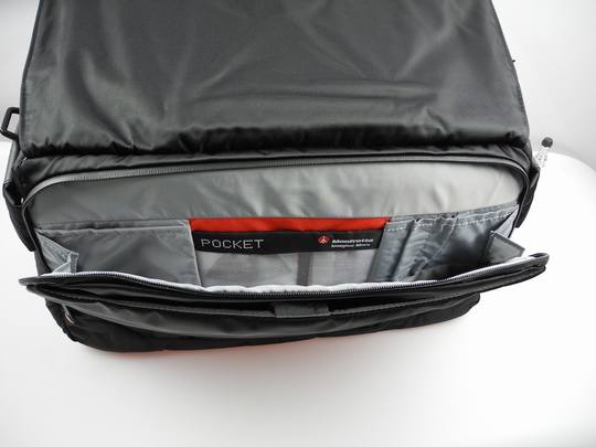 MB LM050-7BB的巨型LOGO盖子打开后是一个可以装IPAD,杂志等超薄型的袋子,这个袋子的容量有限,建议以轻薄为主,不过贴心的厂商还在袋子的顶端设计了一个粘贴型按扣,可以在东西多的情况下,使用这个小功能。