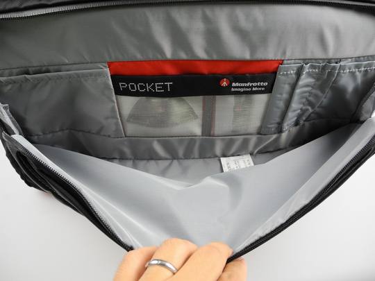 接下来是内层的主侧袋,它采用了特别打造的防水涂层拉链,即使在雨天使用也不会将里面的东西淋湿,拉链上面印有曼富图的彩色LOGO,十分的彰显活力。