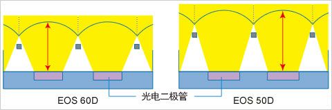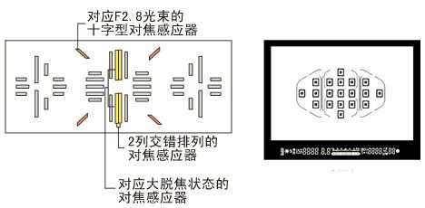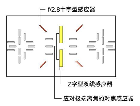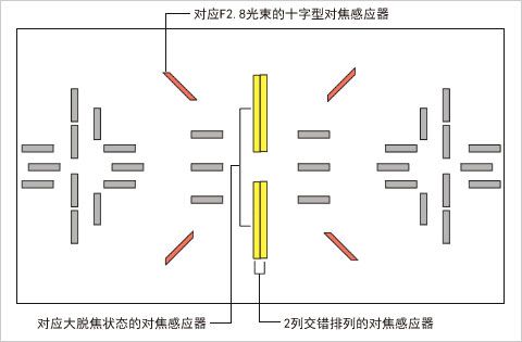 60D仍然沿用了50D,9点十字型对焦感应器。但在50D基础上有所提升。在使用频度较高的中央上、中、下3个自动对焦点脱焦对焦感应器部分,早先50D所使用的Z字型双线感应器被放弃,随之改为了2列交错排列感应器。上下错开半个像素交错式排列的一组三段式,能够降低对焦的偏差。在大脱焦状态下也能够相对迅速的合焦于被摄体。这一方式在7D中曾被使用,但是在60D时被相应简化。