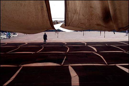 老德里,印度, 贾玛清真寺里穿过遮阳帐篷的伊斯兰教徒