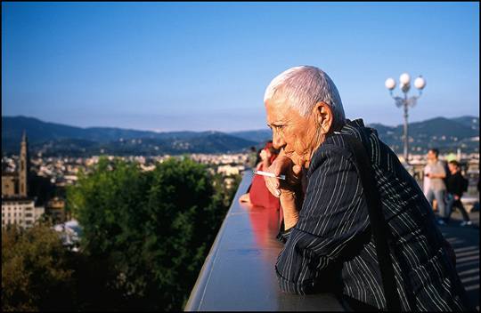 佛罗伦萨,意大利,站在山顶等待观看日落的白色短发女人