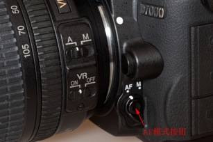 前面提到D90机身顶部的AF模式按钮被移动到镜头前面,这是的AF模式按钮,与AF模式拨杆集成在一起。拨杆有两个选择:AF(自动对焦)和M(手动对焦)。按下AF模式按钮同时转动机身上的主指令盘(快门按钮前方)用户可以选择AF-A(自动伺服AF:相机自动选择单次伺服对焦或者连续伺服对焦)、AF-S(单次伺服对焦)、AF-C(连续伺服对焦)。我认为这种双设置过于复杂,还不如把AF模式拨杆设计为四个位置更方便:AF-A、AF-S、AF-C、M。