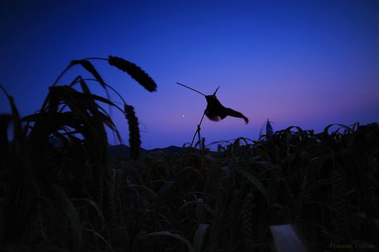 夜深了,稻草人张开双臂,在新月下舞蹈
