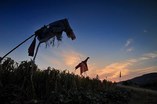 清晨的田野没有一丝风的影子,稻草人都侧耳去听着
