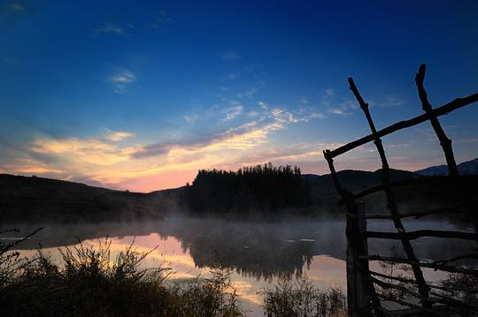 在果园的栅栏前,浮在池塘上的雾气还没散去