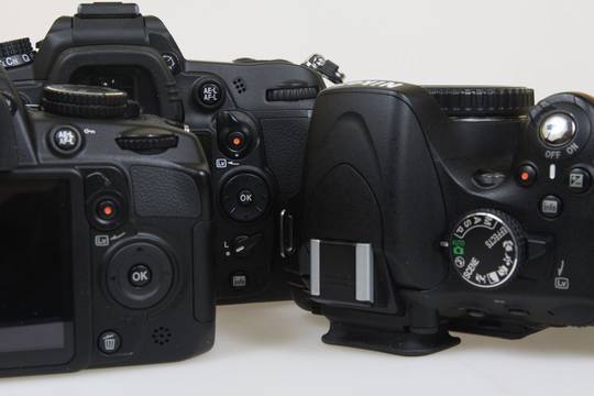 整体转盘、波轮、按键设计上,D5100与D3100相似采用“单转盘、单波轮、无肩屏”的入门设计,机身走小巧轻便路子。D7000则更显专业,继承了D80、D90的“单转盘、双波轮、有肩屏”机身设计,不过这次D7000机身采用了镁合金材料(D90为塑料材质),当然并不是全部镁铝合金制造,相机顶盖和后盖采用了镁合金,提高了耐用性,同时,所有接缝密封,实现了和D300S同样的防水和防尘效果。其它部分使用了塑料材料,兼顾了小型化和轻巧化。