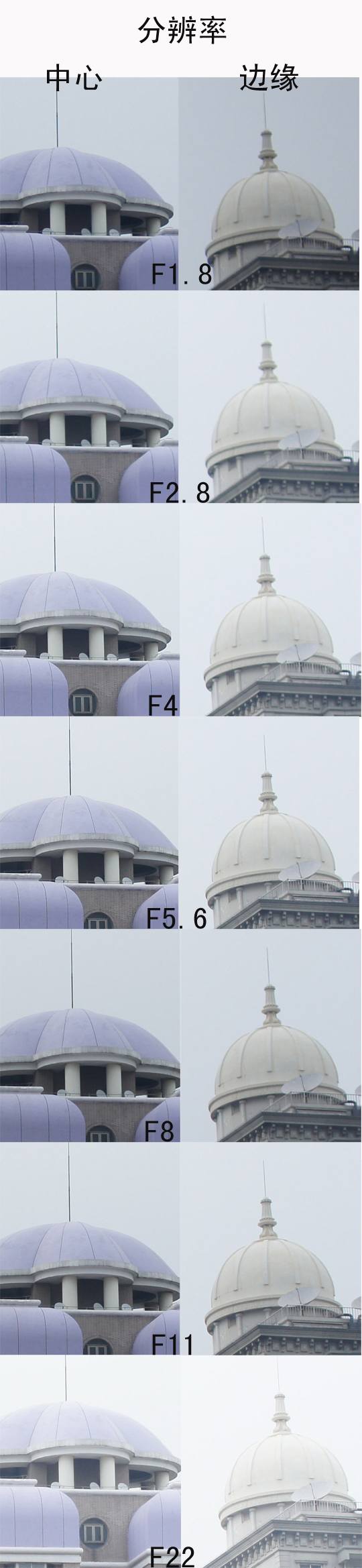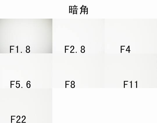 除了在F1.8情况下四周有明显暗角外,其他档位下都没有太严重的暗角情况。