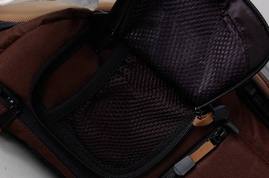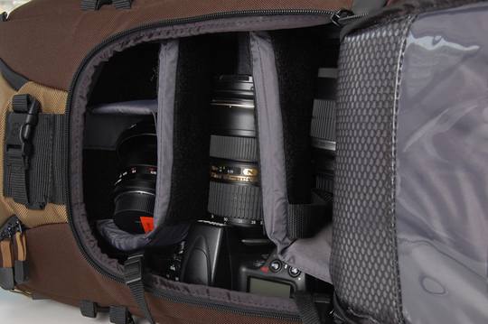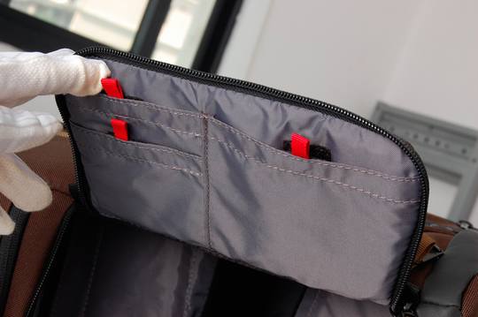 通我们最后来看一下机构配置,下隔层空间较大用来放置器材,可从单独的前开口处放入器材,也可从两侧开口处方便快捷地取出相机。产品可以容纳一个带手柄和镜头的数码单反相机,1到2支备用镜头,闪光灯和配件。但是多重开启的方式比较不台适合粗心大意的用户。