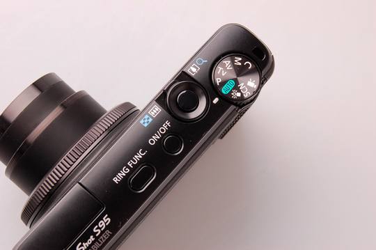 在机顶部分的RING FUNC和开关按钮互换了一下。快门的设计与前代少有不同,这或许是这款产品在外观布局上较明显的不同。(S90时代增加的控制环元素,配合机身顶部RINGFUNC键,可以实现对ISO感光度、焦距切换、白平衡等功能的手动调节。)