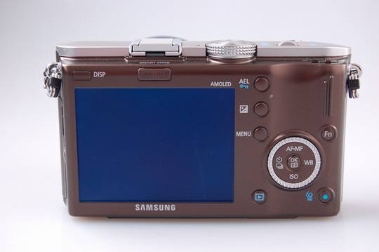 机背部分设计相对清晰,除61.4万像素的3.0"AMOLED显示屏外。AEL(曝光锁定)、曝光补偿以及菜单顺序从上至下排列。而五位导航拨轮四个方向涵盖了自动对焦、连拍/定时以及白平衡ISO五个键,这种设计非常类似于DC。FN模式快捷键被安排在了最右侧。地步则是播放和删除键。DISP键被孤零零的设置在了左肩。我们在热靴后方找的EVF插口,目前这款相机应该没有推出这类产品,不过显然三星应该有这个打算了。