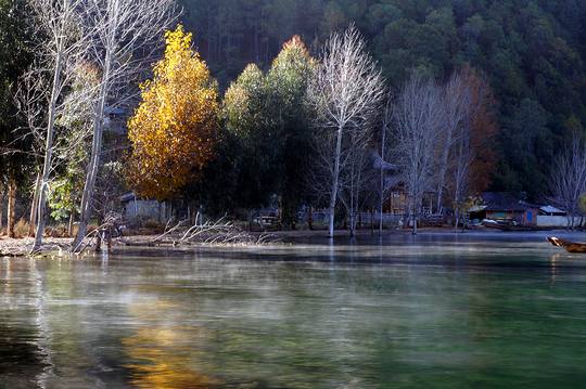 阳光直射后,湖面升腾的雾气和湖边的树木交相辉映,颜色多彩夺目
