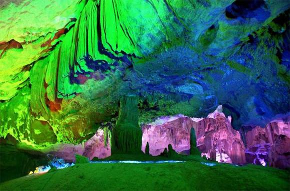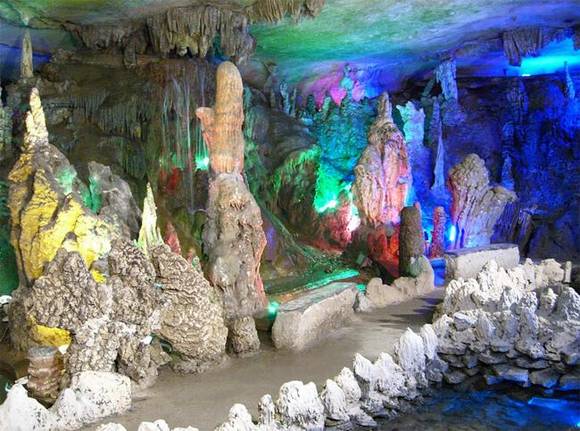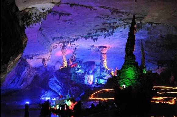 岩洞分上、中、下三层,开发游览的在中层,全长1100米,游程814米,最高处27米,最宽处50米。以雄伟、曲折、深邃著称。洞内布满钟乳石,石笋、石柱、石幔、石花等,层层叠叠,形态各异,姿态万千,构成壮丽的地下画廊,素有“神仙洞府”之称。