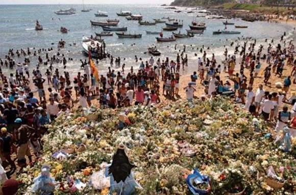 中午时,当四处响起桑巴音乐,非洲鼓声在峭壁间回荡,整个海湾洋溢着节日的狂热。献礼是用小船载着装满礼物的篮子驶到海上去,然后把篮子放在水面上,如果篮子沉入海底,就表明海神接收礼物,日后会满足献礼者的请求,否则,篮子就会漂回岸边。当音乐和狂热气氛戛然而停,海湾沉静下来,献礼船就要出海。此时,一个女祭师头顶大篮子,后面跟着的一群手中拿着篮子的侍女,顺着石阶走向海滩,许多小船停泊在那里,等待着执行神圣的使命。接着,小船驶近岸边,接受装满礼物的篮子,那些献礼者都站在齐腰深的水中,把篮子递过去。小船慢慢向大海驶去,后面跟着一些装饰漂亮的帆船和游艇,乘客都带着自己的礼物。小船驶向远离岸边的目的地后,船上的人便把最大的一个篮子举起来放在水上,接着把所有的篮子都扔下去,篮子打一个旋转,就沉到海底去了,只留下一束鲜花漂在海面上。