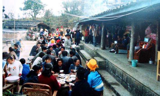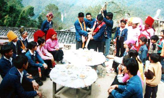 结婚仪式结束,男方的客人快来时,新娘到半路迎接,到离家一公里处,众客人坐下不走了。新娘说:“辛苦了,请到家里坐!”众姑娘回答:“你倒好意思说,姐夫都不请我们,你家在哪里我们都晓不得,咋好意思去!”这时新郎在小伙子簇拥下来到了。小伙子们先开口:“请到家里坐!”姑娘们不买帐:“姐夫都不叫,你们喊有什么用!”新郎只得上前弯腰作揖,请姑娘们到家里坐。姑娘们走五、六公尺又不走了;新郎只得作揖再请,如此三十多次才把这些人请进家。新娘的女伴把大饭盒里的鸡肉和饭装在碗里,由“贺哨”(姑娘们的领头)给小俩口吃,希望他俩同甘共苦。吃到快饱时,寨里的小伙子进来把门堂屋门关紧,端着饭菜,唱着山歌,请姑娘们吃一碗: “红米糙饭格是不合口?腌菜素饭格是不合心?一碗红米糙饭吃不完,一杯淡酒喝不光!”姑娘们接唱:“红漆桌子黑漆边,八碗九碟摆中间,我们一人吃了半斗米,淡酒当做酽酒喝。”对歌对到半夜,小伙子把姑娘们送回寨子。