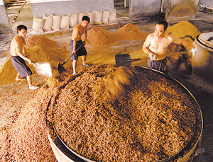 3.蒸煮糊化。利用蒸煮使淀粉糊化。有利于淀粉酶的作用,同时还可以杀死杂菌。蒸煮的温度和时间视原料种类、破碎程度等而定。一般常压蒸料20~30分钟。蒸煮的要求为外观蒸透,熟而不粘,内无生心即可。将原料和发酵后的香醅混合,蒸酒和蒸料同时进行,称为“混蒸混烧”,前期以蒸酒为主,甑内温度要求85~90℃,蒸酒后,应保持一段糊化时间。若蒸酒与蒸料分开进行,称之为“清蒸清烧”。