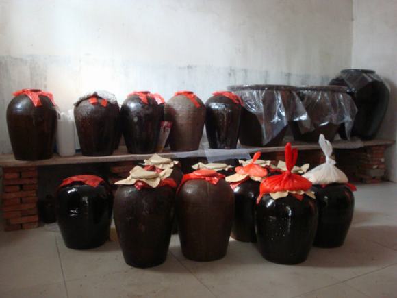 制作方法:选用无污染大枣,用温水清洗,晾干。将红枣掰开去核,用串蒸工艺进行蒸馏,蒸出枣味浓郁的红枣酒。再用清洗干净的玻璃缸把蒸馏出来的酒喝串蒸过的红枣泡制一起5天以后即可饮用。