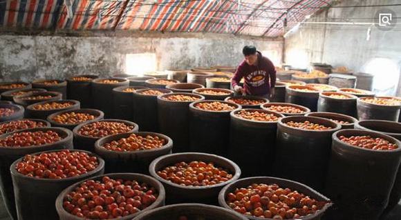 柿子是我国的特色果品,目前年产量在4万吨左右。柿子的营养价值很高,富含维生素c,每百克柿果中含Vc49--72g,是橘子的2倍、香蕉的8倍、葡萄的10倍,柿子中还含有大量黄酮类化合物、单宁等酚类物质,具有抑制血小板凝结、防止低密度脂蛋白氧化,软化血管的作用。柿果中含有很多还原糖。主要成分是葡萄糖、果糖和甘露糖醇。这些糖经酒精发酵作用,分解成酒精和二氧化碳。发酵的快慢主要与酵母菌的多少、酵母菌活动环境有关。在25~30℃,含糖量不超过12%时发酵最快。柿子中的单宁会妨碍其活动,最好在加入酵母菌时,先加入黑曲菌将单宁分解(或加碱中和)。进行发酵时,以密闭室不供给氧气条件下发酵,才能充分地将糖变成酒精。