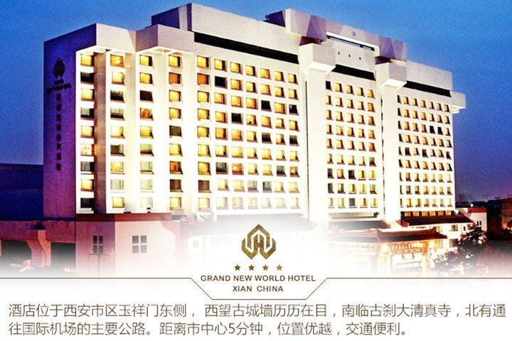 서안 그랜드뉴월드 호텔은 서안시 중심에 자리잡고 있으며 회족 먹거리, 서안 고성벽 (옥상문, 상무문)과 멀지않으며 서오대, 광인사, 대청진사와 인접하였다. 호텔 입구는 공중 버스역 및