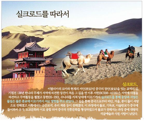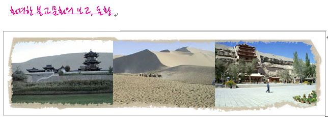 돈황은 서역으로 출발하는 실크로드의 출발점이자 동서의 문화가 최초로 교류한 장소였다. 이곳에서 특히 동서의 승려들이 모여 불교예술을 꽃피웠으며 그로 인해 세계문화유산으로 빛나는 중국 최대의 석굴인 막고굴(莫高窟)을 비롯해 많은 벽화와 불상이 남아있다. 길이 1.6km의 바위산을 파서 만든 493개의 동굴에 어마어마한 규모의 프레스코화와 수많은 채색 조각들이 남아있는 막고굴은 세계에서 역사가 가장 오래되었으며 가장 완전하게 보존되어 있는 불교문화의 보고이다.