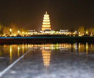 Пагода Большого Гуся (Da Yan Ta) стоит на бывшем месте Храма Материнской Любви, на юге Сианя, за городскими стенами. Этот универсальный знак города, используемый на всех открытках и путеводителях как визитная карточка Сианя, был построен в 648 году н.э. третьим императором династии Тан, Гао Цзуном (Gao Zong), в память о своей умершей матери. Первоначально пагода состояла из пяти этажей, затем она много раз пристраивалась, перестраивалась и росла. Помимо памяти о матери, целью ее строительства было хранение буддистских писаний, привезенных из Индии путешествующим монахом Сюань Цзаном (Xuan Zang). Он перевел и обработал манускрипты в 1335 томов на китайском языке. Нынешнее здание пагоды, 64 м высотой, похоже на крепость. Можно взобраться наверх, чтобы полюбоваться видом на город и окрестности. |