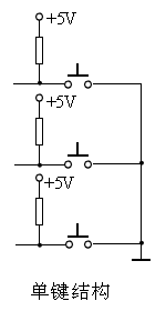 但是,这样的结构设计键盘有一个很大的缺点,就是当键盘上的键较多时,引线太多,占用的 I/O端口也太多。比如一 个有64键的键盘,就需要64条连线和8个8位端口。所以,这种简单结构只用在仅有几个键的小键盘中。