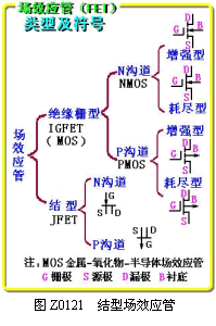场效应管有两大类,结型场效应管JFET和IGFET,后者性能更为优越,发展迅速,应用广泛。图Z0121 为场效应管的类型及图形、符号。