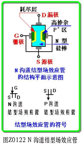为N沟道结型场效应管结构示意图和它的图形、符号。它是在同一块N型硅片的两侧分别制作掺杂浓度较高的P型区(用P+表示),形成两个对称的PN结,将两个P区的引出线连在一起作为一个电极,称为栅极(g),在N型硅片两端各引出一个电极,分别称为源极(s)和漏极(d)。在形成PN结过程中,由于P+区是重掺杂区,所以N一区侧的空间电荷层宽度远大二、工作原理