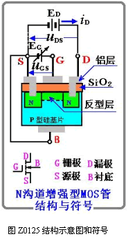 图Z0125是N沟道增强型MOS管的结构示意图和符号。它是在一块P型硅衬底上,扩散两个高浓度掺杂的N+区,