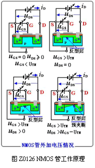 图Z0125中衬底为P型半导体,在它的上面是一层SiO2薄膜、在SiO2薄膜上盖一层金属铝,如果在金属铝层和半导体之间加UGS,则金属铝与半导体之间产生一个垂直于半导体表面的电场,在这一电场作用下,P型硅表面的多数载流子-空穴受到排斥,使硅片表面产生一层缺乏载流子的薄层。同时在电场作用下,P型半导体中的少数载流子-电子被吸引到半导体的表面,并被空穴所俘获而形成负离子,组成不可移动的空间电荷层(称耗尽层又叫受主离子层)。UGS愈大,电场排斥硅表面层中的空穴愈多,则耗尽层愈宽,且UGS愈大,电场愈强;当UGS 增大到某一栅源电压值VT(叫临界电压或开启电压)时,则电场在排斥半导体表面层的多数载流子-空穴形成耗尽层之后,就会吸引少数载流子-电子,继而在表面层内形成电子的积累,从而使原来为空穴占多数的P型半导体表面形成了N型薄层。由于与P型衬底的导电类型相反,故称为反型层。在反型层下才是负离子组成的耗尽层。这一N型电子层,把原来被PN结高阻层隔开的源区和漏区连接起来,形成导电沟道。