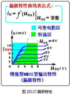 N沟道增强型MOS管输出特性曲线如图Z0127所示,它是UGS为不同定值时,ID 与UDS之间关系的一簇曲线。由图可见,各条曲线变化规律基本相同。现以UGS=5V一条