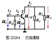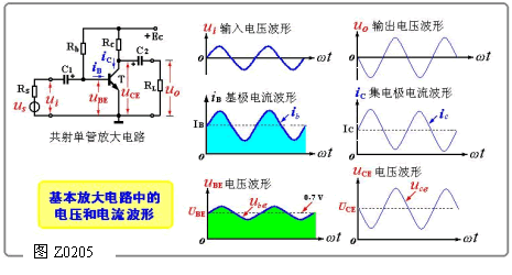 据此原则即可画出基本放大电路的交流等效电路,称为交流通路。基本放大电路(固定偏置电路)的交流通路如图Z0204所示。图中RL为外接。当输入信号ui加到放大电路输入端时,电路就由静态转入放大信号的动态。即当ui输入后,通过C1耦合使发射结上的发生了变化:由UBE变为UBE +ui;于是晶体管基极发生变化:IB→IB + ib;其变化量 ib通过晶体管的电流控制作用使 iC发生变化,即 iC →IC + βib集电极电流通过RC,在上的电压也就发生变化: iCRC→ICRC+ iCRC;从而使uCE→UCE + uce通过隔直耦合C2将直流成份UCE隔断,只把变化量传到输出端,使得到输出电压uo按ui的变化规律变化,但uo比ui大许多倍,这就相当干将ui"放大"了。动态时,电路中各处电压、电流的波形如图图Z0205中所示。由图可见,晶体管各极电流、电压均为脉动直流。在ui的整个内,uBE > Vγ,uCE > 0,这就保证了晶体管始终工作在放大状态。由图还可以看出,在没有(即合理设置Q点)的情况下,晶体管各极电压、电流均可视为交流分量与直流分量的线性迭加。