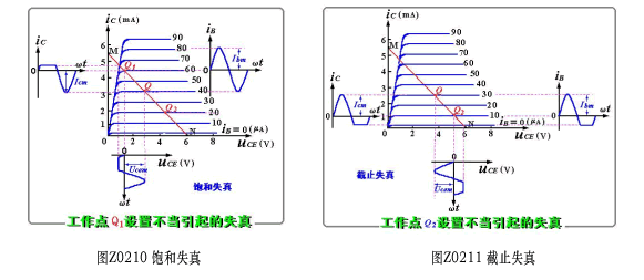 图Z0210、Z0211(表明因Q点选择的过高或过低而导致在输入信号部分时间内,晶体管进入饱和区或截止区而产生的失真,分别称为饱和失真和截止失真。